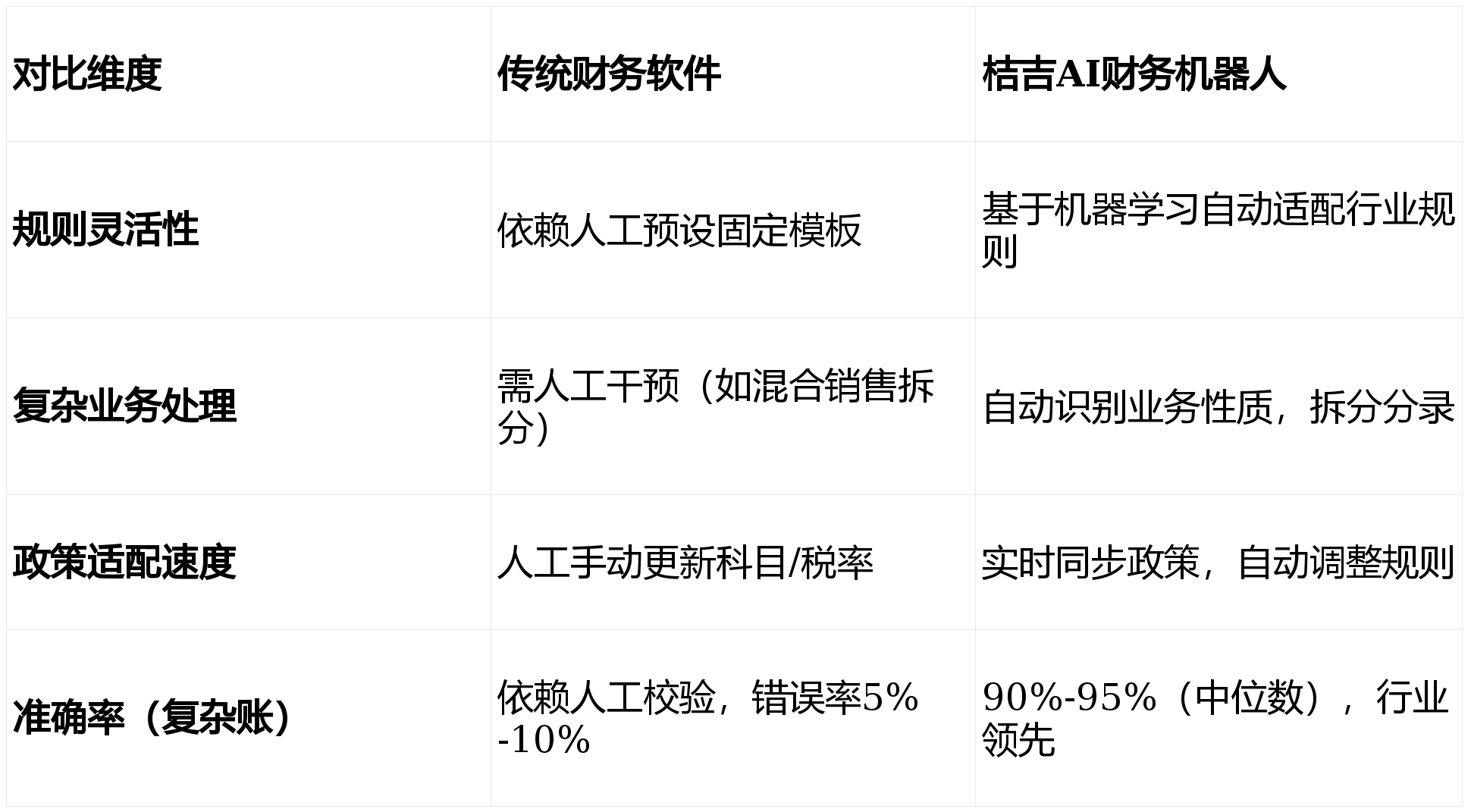 桔吉士工智能研发的桔吉财政机械人的分录生成精确率达90%-95%(复杂账准确率中位数),这项工做完全依赖人工判断,本来1名会计月均处置40-60家企业账务,效率瓶颈:通俗会计月均处置80-100套账务,深圳某处置高端海外营业的企业,不只耗时耗力,